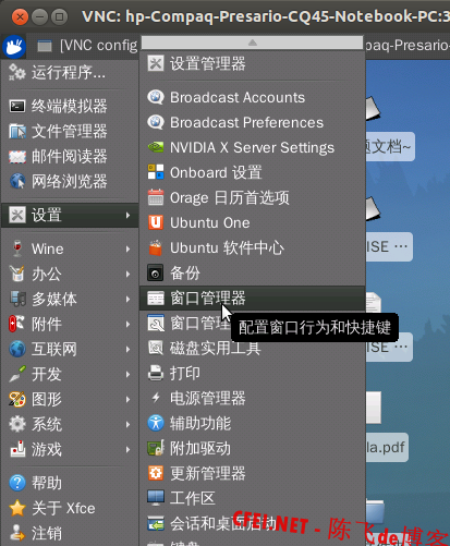 2. 此法不需要重启系统,可以直接在远程桌面中设置,打开菜单->设置->窗口管理器,或者在终端中输入xfwm4-settings打开(xfwm4就是xfce4 window manger的缩写)